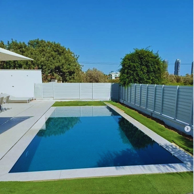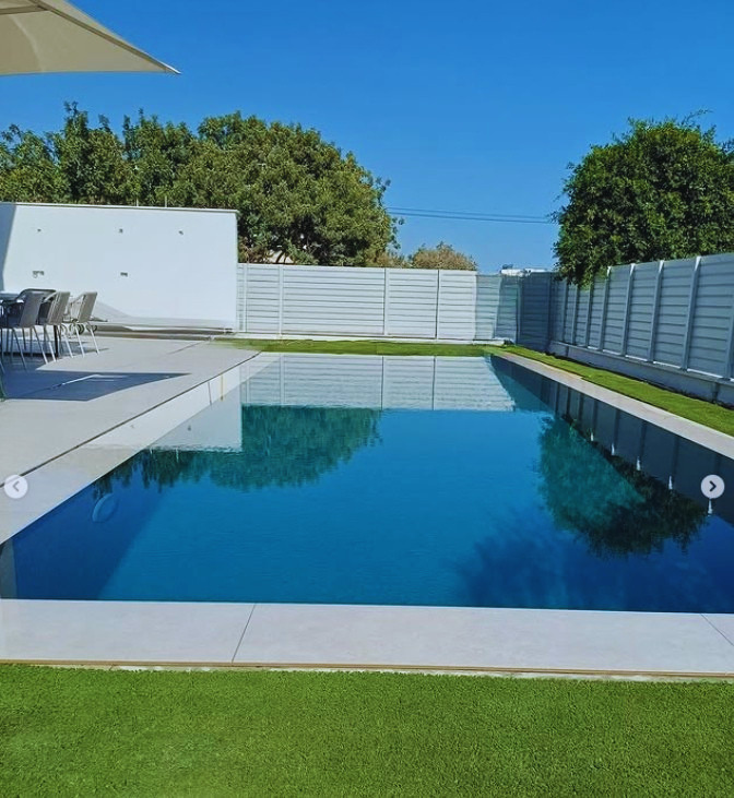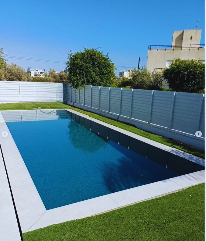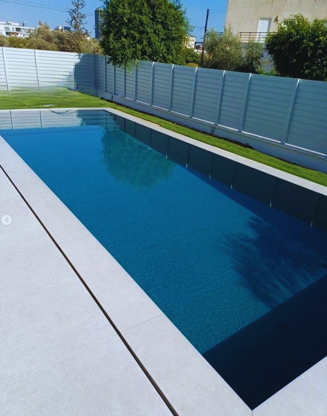 A contemporary overflow swimming pool finished with high-quality PVC liner, designed to deliver a seamless water level and a striking mirror-like effect. The clean geometric shape and modern surroundings highlight the elegance of the overflow system, while the PVC liner ensures durability, easy maintenance, and a smooth finish. Ideal for creating a luxurious and visually impressive outdoor space.