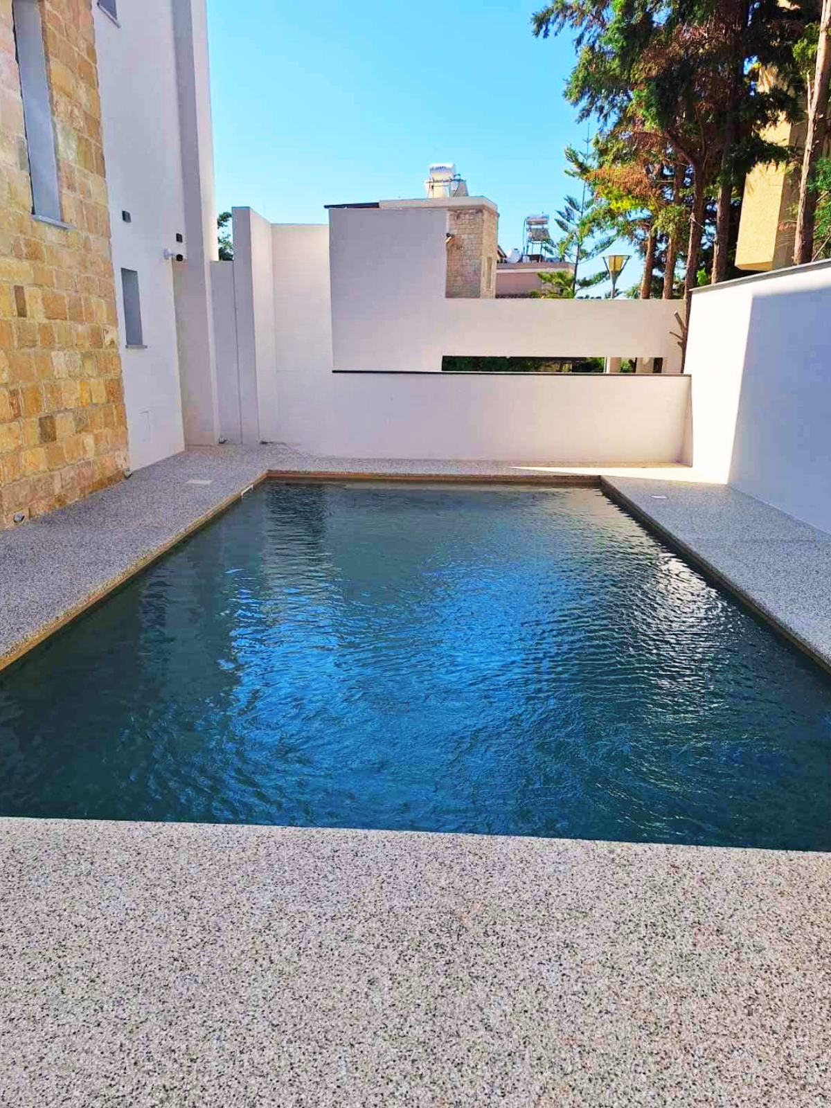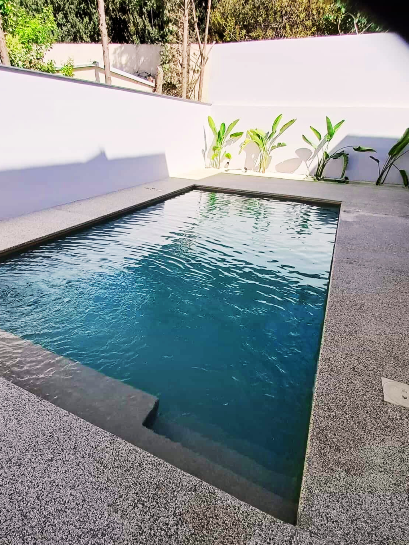 A modern, compact skimmer swimming pool designed to maximize space while delivering a premium aesthetic. Finished with a high-quality PVC 3D liner, it offers durability, smooth texture, and a refined dark water tone. The minimal design is complemented by elegant surrounding surfaces and subtle landscaping, creating a private and relaxing atmosphere—ideal for contemporary homes.