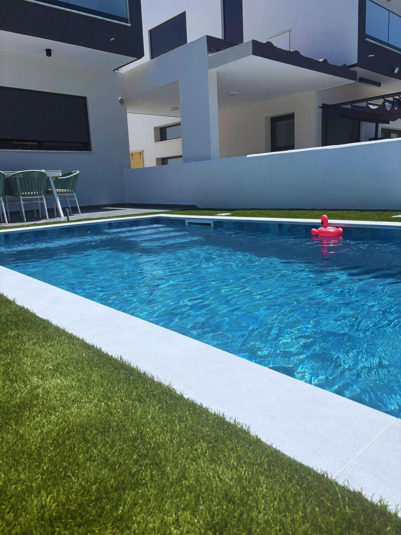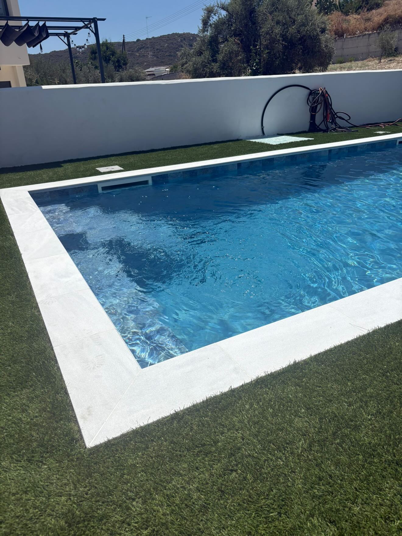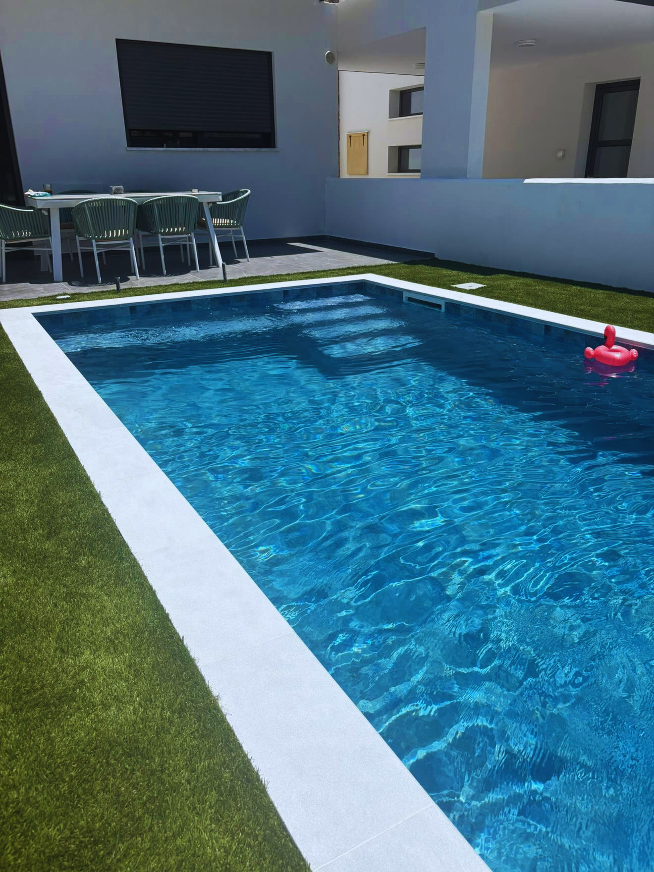 A modern skimmer pool finished with a premium 3D PVC liner in Stone tile Marine, designed to combine elegant aesthetics with long-lasting durability. Its crystal-clear water, clean architectural lines, and natural stone-effect finish create a stylish and low-maintenance outdoor space for everyday comfort and relaxation.