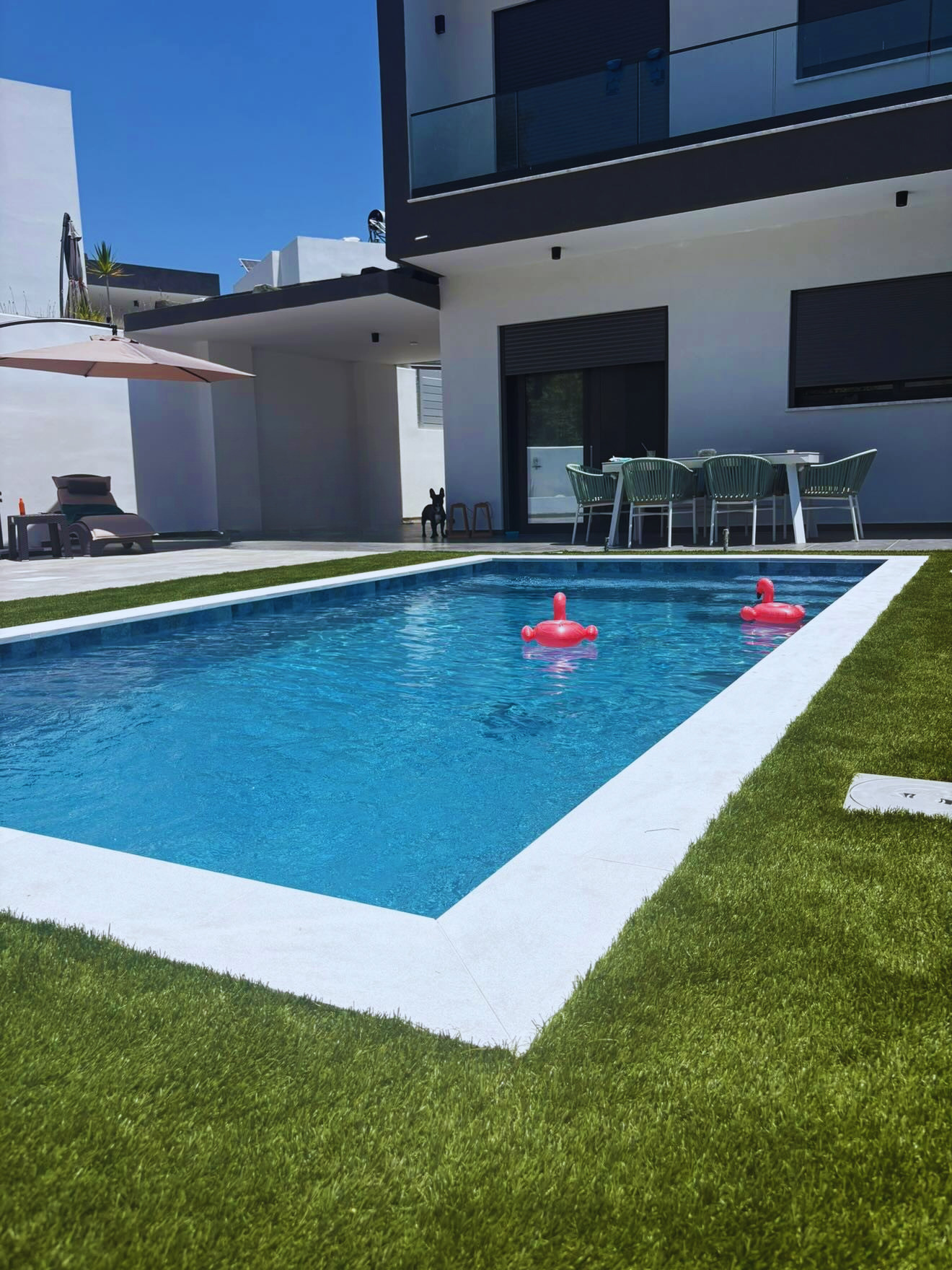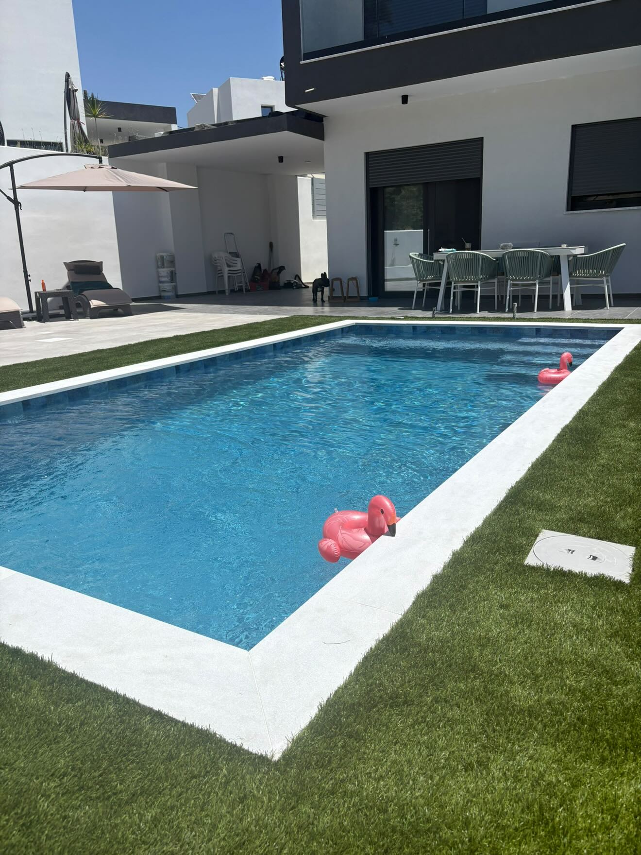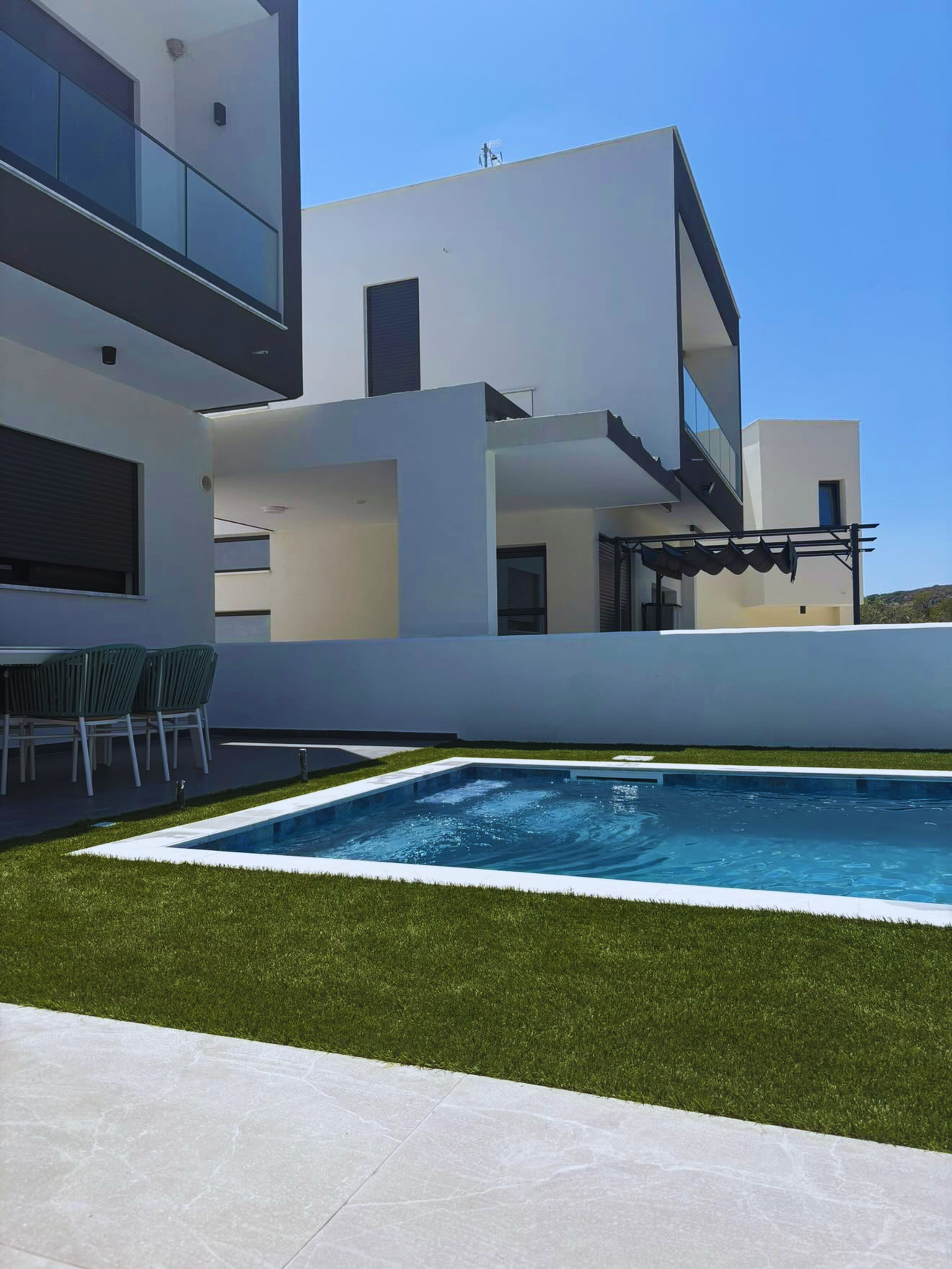 A modern skimmer pool finished with a premium 3D PVC liner in Stone tile Marine, designed to combine elegant aesthetics with long-lasting durability. Its crystal-clear water, clean architectural lines, and natural stone-effect finish create a stylish and low-maintenance outdoor space for everyday comfort and relaxation.